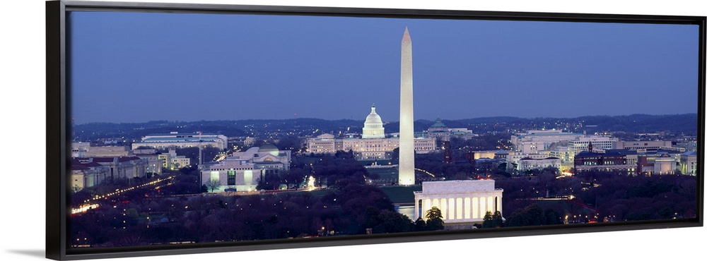 <p>Panoramic photograph of the United States capital at dusk, showing several landmarks including the Washington Monument, the Lincoln Memorial, and the Capitol Building.</p>