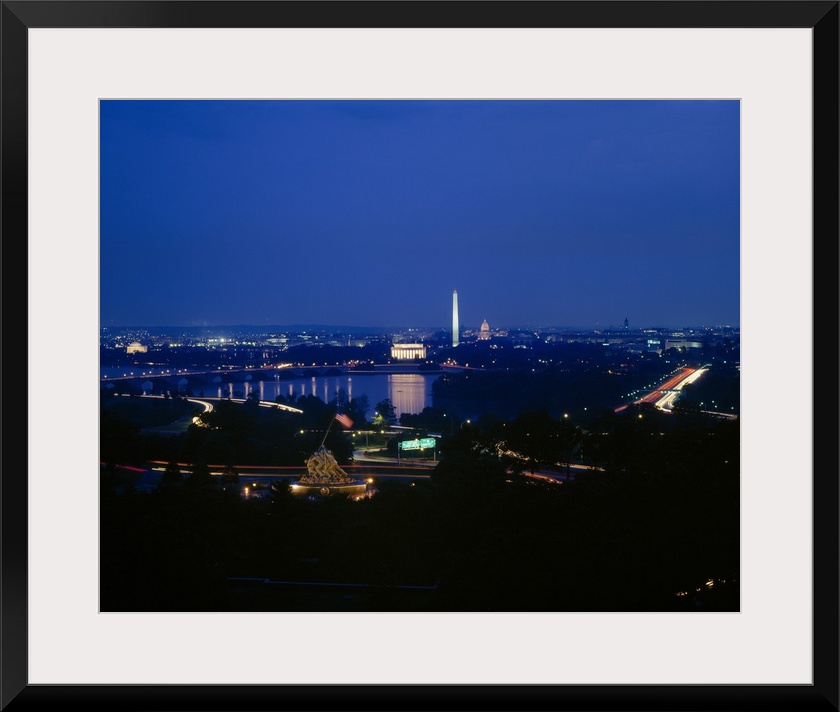 <p>This large piece is a high angle photograph at night of Washington DC with many monuments lit up and in view.</p>