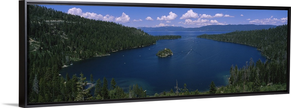<p>Big panoramic photo of Lake Tahoe, California (CA). The land surrounding the lake is covered with thick forest and boats and a small wooded island are visible.</p>