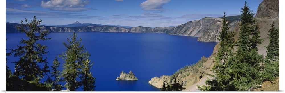 <p>Panoramic photograph taken from an aerial view overlooking a large body of water surrounded by mountainous terrain in the Northwestern United States. In the foreground of this picture, a few tall trees can be seen on the edge of this large body of calm water.</p>