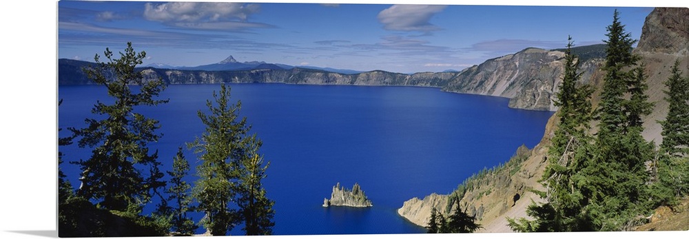 <p>Panoramic photograph taken from an aerial view overlooking a large body of water surrounded by mountainous terrain in the Northwestern United States. In the foreground of this picture, a few tall trees can be seen on the edge of this large body of calm water.</p>