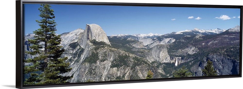 <p>Long and horizontal canvas photo of the Half Dome mountain in Yellowstone with mountains surrounding it.</p>