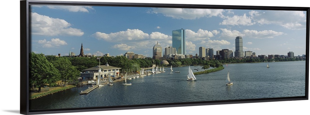 <p>A panoramic photograph of Charles river with sail boats and the Boston skyline in the background. Trees line the edge of the river.</p>