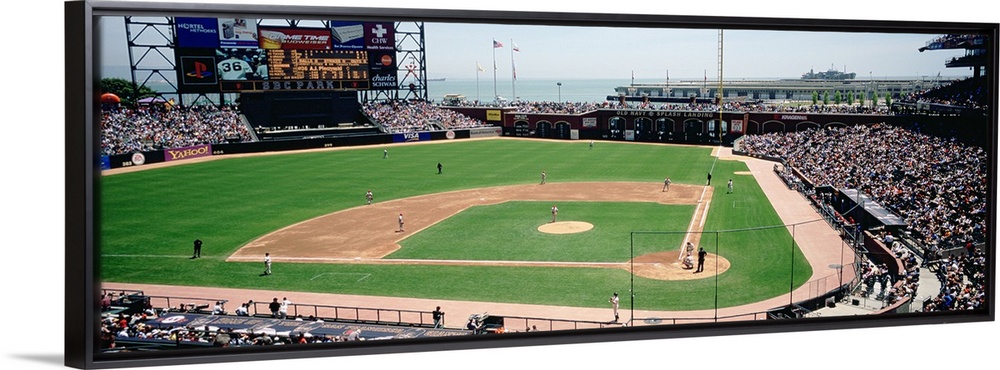 <p>This decorative wall art is a panoramic canvas of a baseball stadium in the middle of a game.</p>