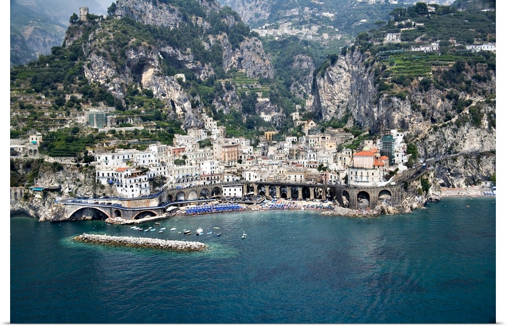 <p>This decorative wall art is an aerial photograph of an Italian village and harbor build into steep costal hills.</p>