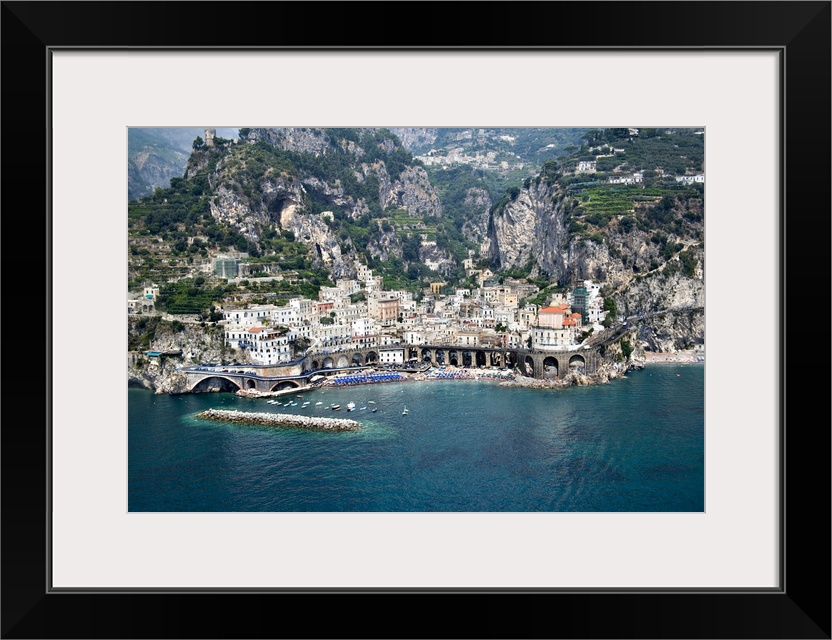 <p>This decorative wall art is an aerial photograph of an Italian village and harbor build into steep costal hills.</p>
