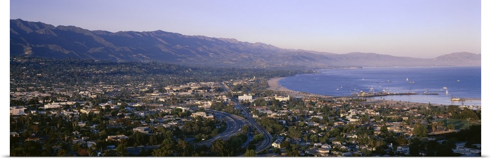 <p>Panoramic photo print of the Pacific Ocean meeting Santa Barbara and the rolling mountains in the distance.</p>