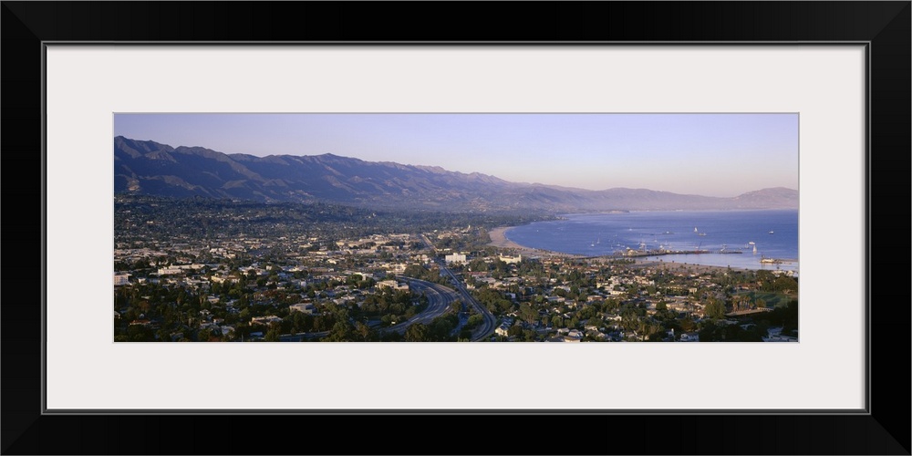 <p>Panoramic photo print of the Pacific Ocean meeting Santa Barbara and the rolling mountains in the distance.</p>