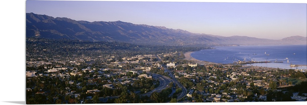<p>Panoramic photo print of the Pacific Ocean meeting Santa Barbara and the rolling mountains in the distance.</p>