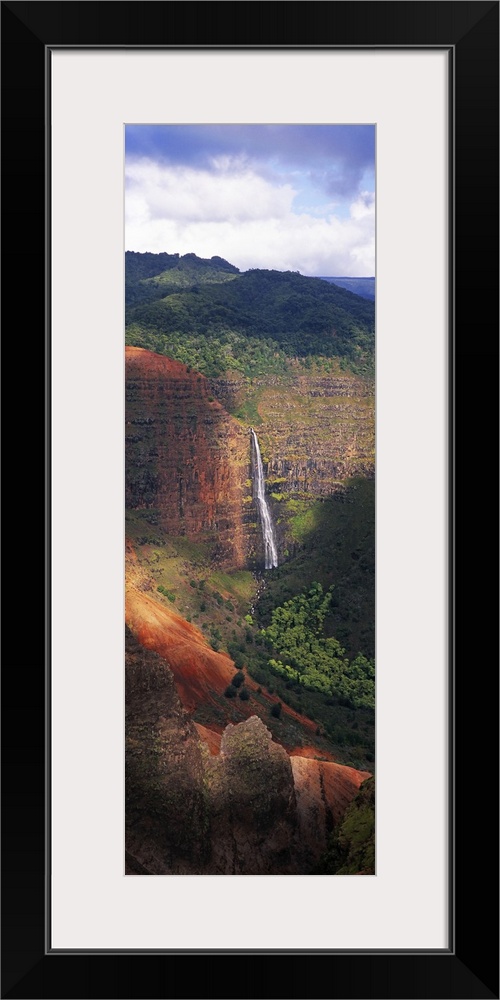<p>Tall photo on canvas of a waterfall flowing off of a giant cliff seen from a distance.</p>