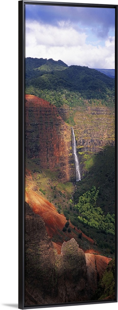 <p>Tall photo on canvas of a waterfall flowing off of a giant cliff seen from a distance.</p>