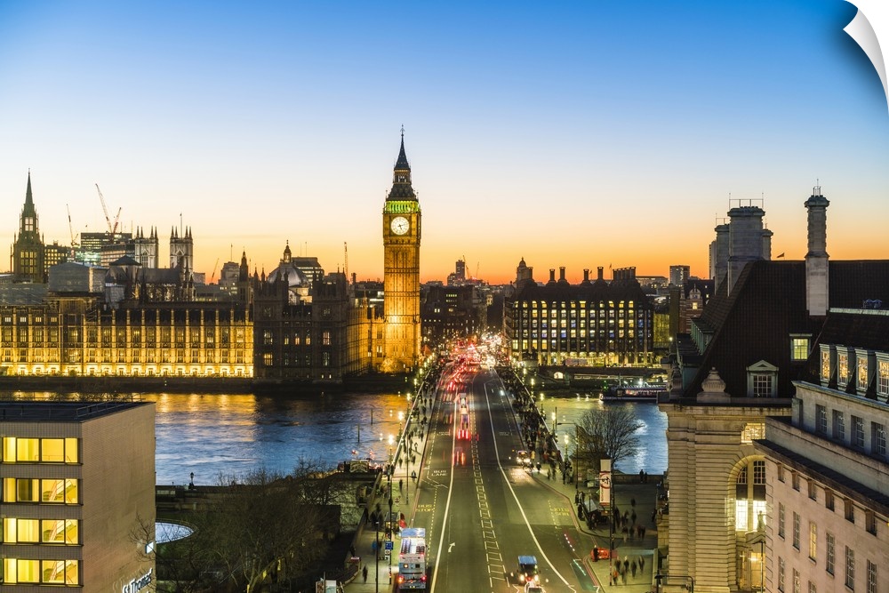 <p>View of Big Ben, the Palace of Westminster and Westminster Bridge at dusk, London, England</p>