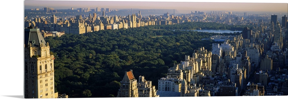 <p>Panoramic canvas photo of the trees and lake in Central Park surrounded by the buildings of the city.</p>