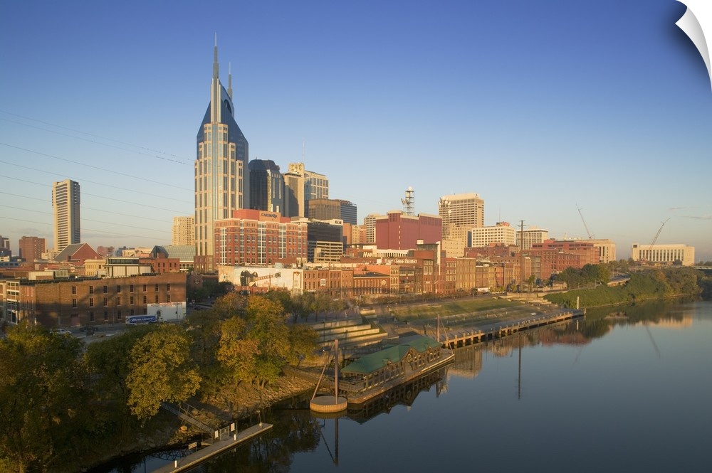 <p>This oversize piece is a photograph taken of the skyline in Nashville that sits along a body of water.</p>