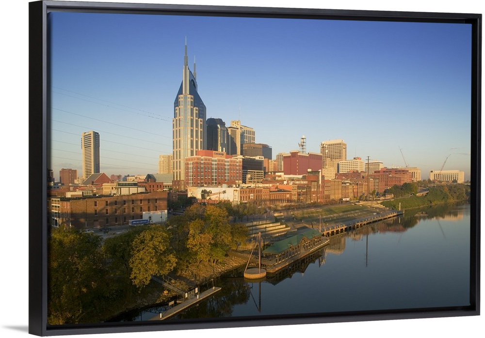 <p>This oversize piece is a photograph taken of the skyline in Nashville that sits along a body of water.</p>