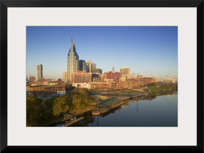 <p>This oversize piece is a photograph taken of the skyline in Nashville that sits along a body of water.</p>