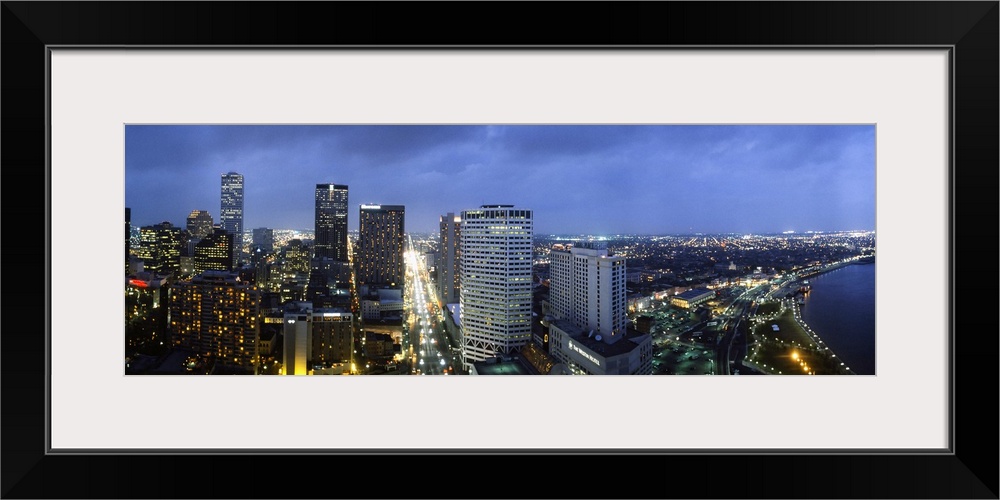 <p>Giant, landscape, high angle photograph of the New Orleans skyline, lit at night, beneath a deep blue sky in Louisiana.</p>