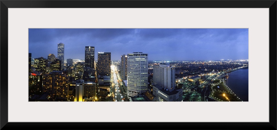 <p>Giant, landscape, high angle photograph of the New Orleans skyline, lit at night, beneath a deep blue sky in Louisiana.</p>