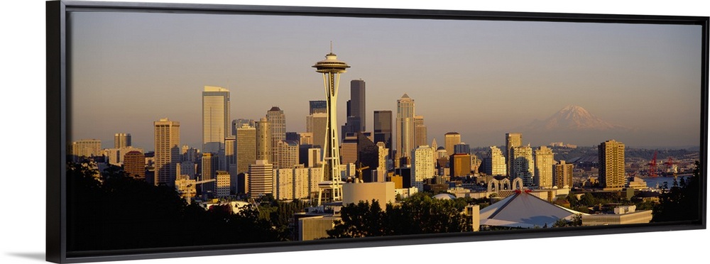 <p>Big, horizontal, high angle photograph of the Seattle skyline, Mount Rainier is slightly visible in the distance.</p>