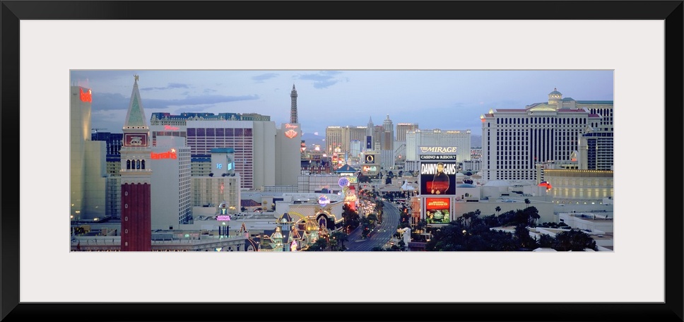 <p>Panoramic photograph taken of part of the strip in Las Vegas during dusk.</p>