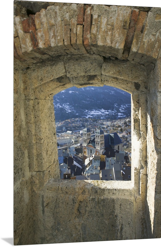 <p>A photograph is taken through a small stone edged window of a town below.</p>
