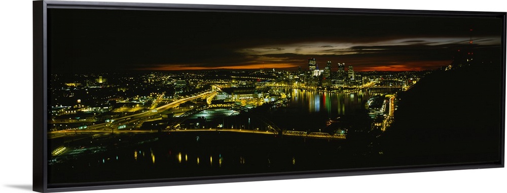 <p>Wide angle, aerial photograph of the city of Pittsburgh, Pennsylvania, brightly lit at night.</p>