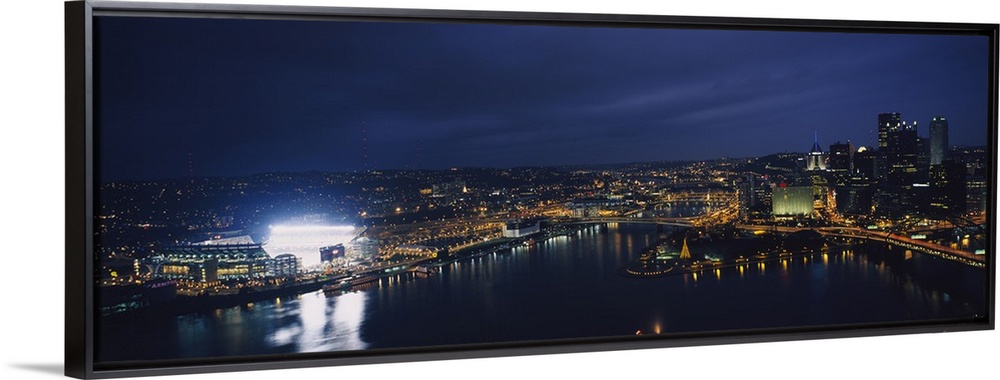 <p>Panoramic photograph of skyline and waterfront at dusk with building lights on.</p>
