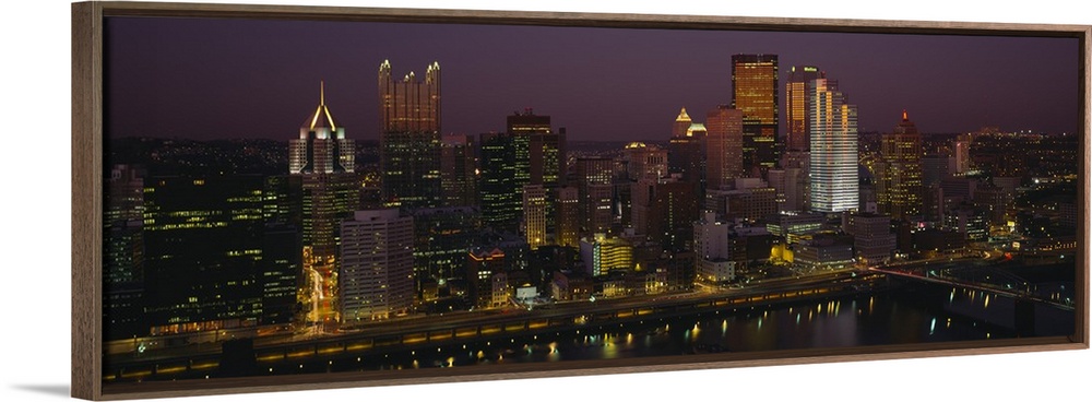 <p>Panoramic photograph of skyline at dusk with tall buildings and skyscrapers glowing in the dark sky.</p>