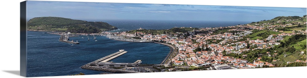 <p>High angle view of cityscape on coast, Horta, Faial Island, Azores, Portugal</p>