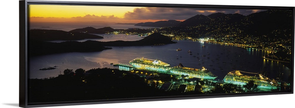 <p>Wide angle, aerial photograph of several cruise ships, lit at night, along the shore of Charlotte Amalie, St. Thomas, US Virgin Islands, as the sun sets over the horizon.</p>