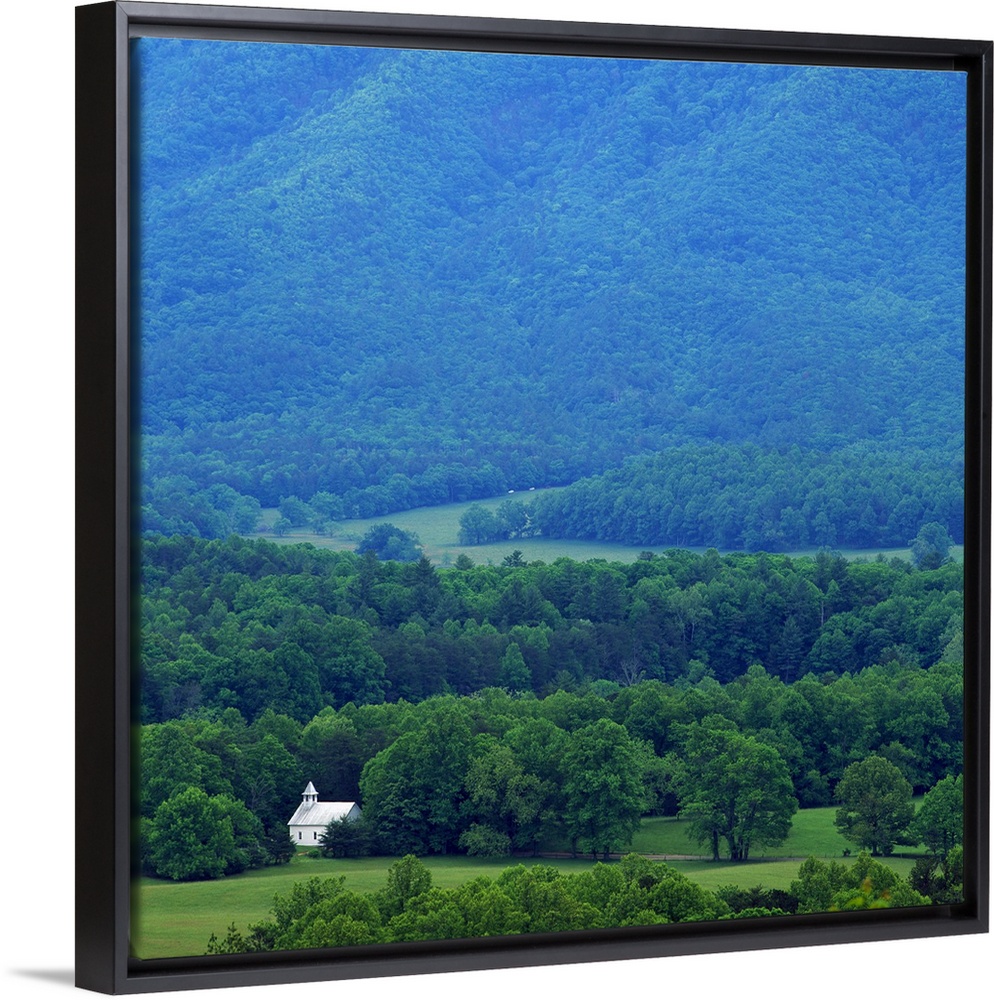 <p>Oversized, portrait, high angle photograph of a small church sitting among a vast landscape of trees in Cades Cove. A large mountain in the background is covered with a light fog, in the Great Smoky Mountains National Park, Tennessee.</p>