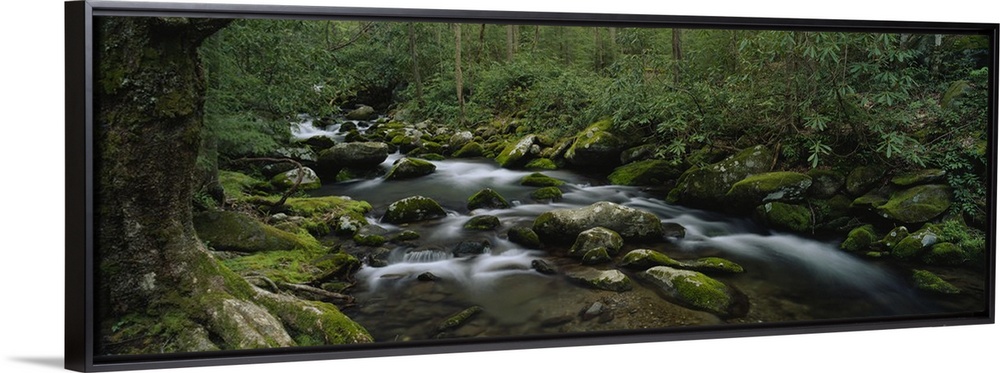 <p>Panoramic photograph on a big canvas of a rocky stream surrounded by a dense, green forest in the Great Smoky Mountains National Park in Tennessee.</p>