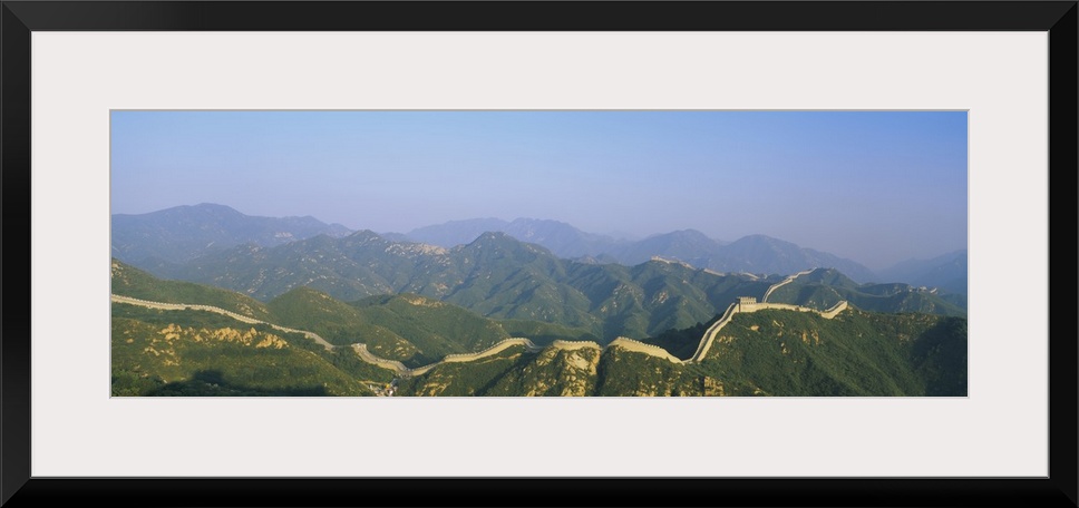 <p>High angle panorama of the mountains and the Great Wall of China.</p>