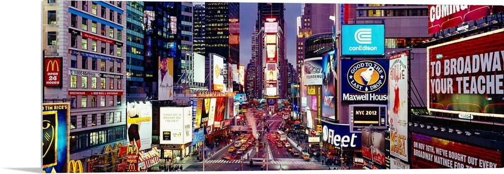 <p>Panoramic photograph of neon signs and city streets downtown.</p>