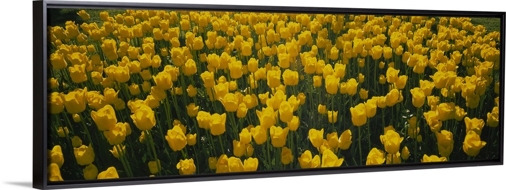 <p>Large horizontal photograph of a dense field of bright, golden tulips in the sun, in Holland, Michigan.</p>