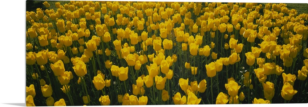 <p>Large horizontal photograph of a dense field of bright, golden tulips in the sun, in Holland, Michigan.</p>