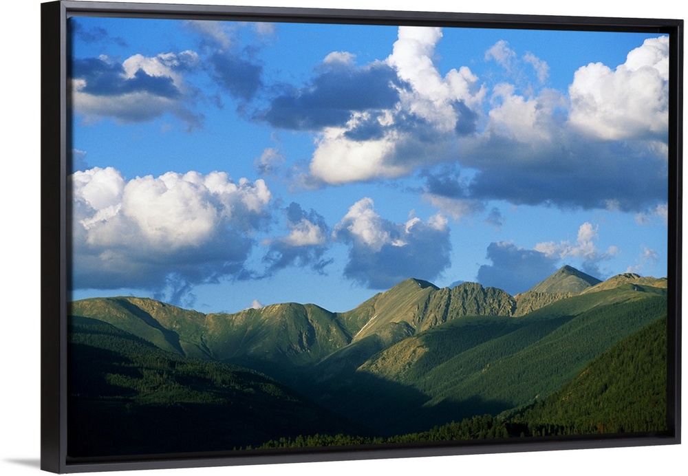 <p>Horizontal photograph on a giant canvas of a blue sky with fluffy clouds over the green, rolling landscape of the Rocky Mountains in the summer, in Colorado.</p>