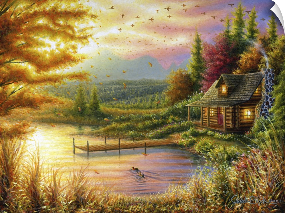 <p>A contemporary idyllic painting of a lake cottage at sunset.</p>