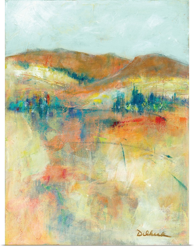 <p>Colorful abstract painting of a hilly landscape.</p>