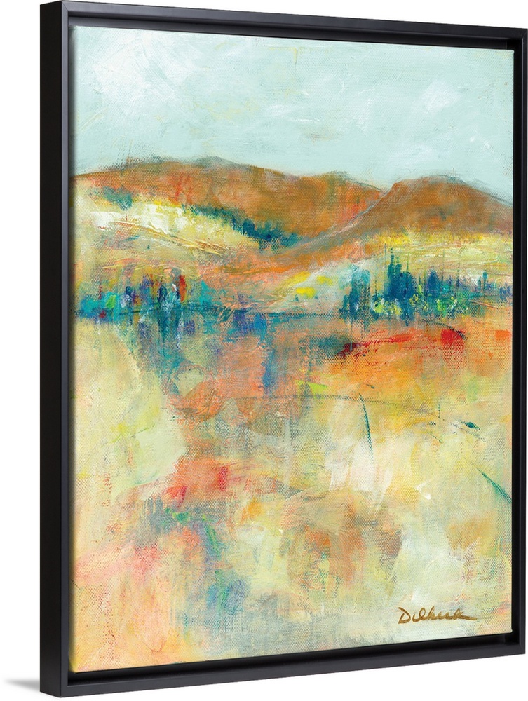 <p>Colorful abstract painting of a hilly landscape.</p>