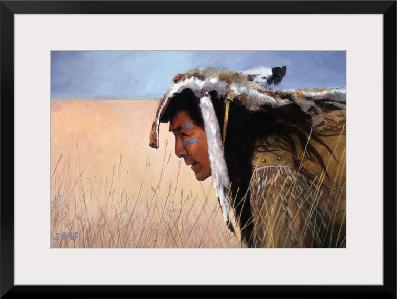 <p>Contemporary western theme painting of a native American man kneeling in tall grass on the plains.</p>