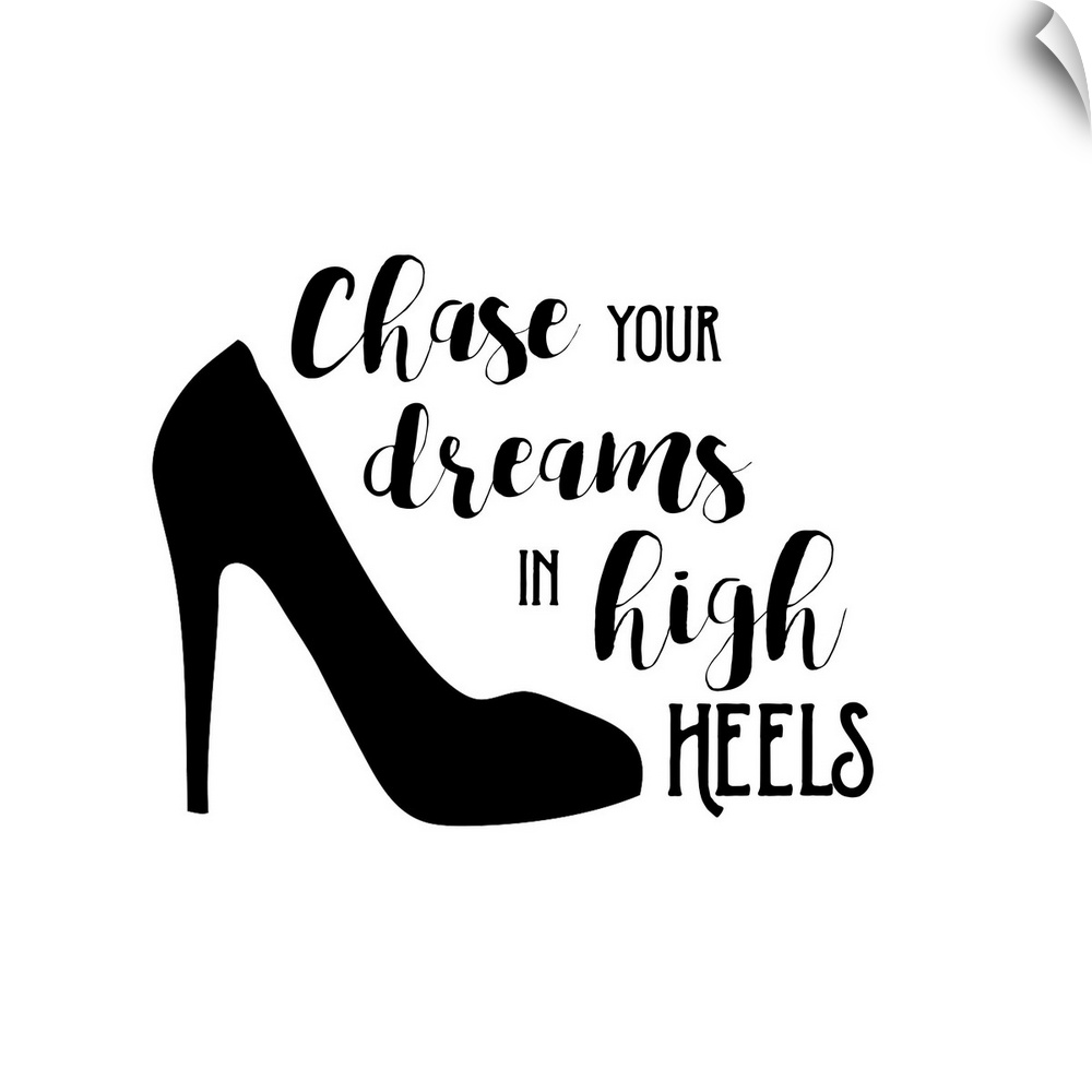 <p>Decorative artwork with the text "Chase Your Dreams in High Heels" with a shoe.</p>