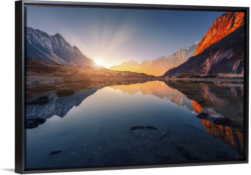 <p>Beautiful landscape with high mountains with illuminated peaks, stones in mountain lake, reflection, blue sky and yellow sunlight in sunrise. Nepal. Amazing scene with Himalayan mountains. Himalayas.</p>