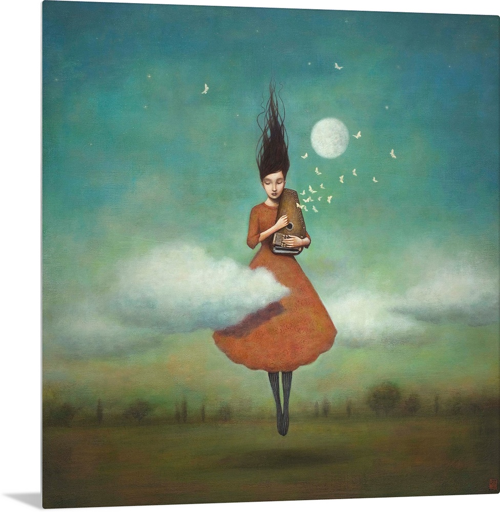 <p>A contemporary surrealist paining of a woman with dark hair and pale red dress holding an instrument levitating off the ground.</p>