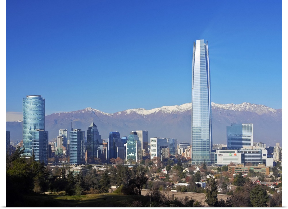 <p>Chile, Santiago, View from the Parque Metropolitano towards the high raised buildings with Costanera Center Tower, the tallest building in South America. Snow covered Andes in the background.</p>