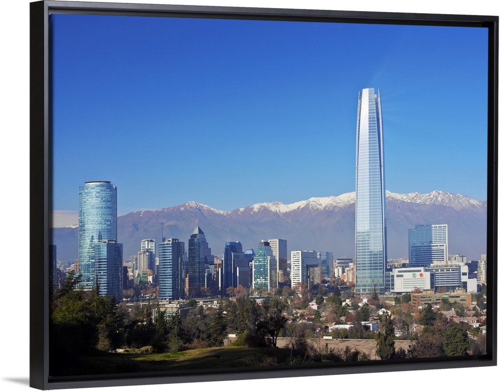 <p>Chile, Santiago, View from the Parque Metropolitano towards the high raised buildings with Costanera Center Tower, the tallest building in South America. Snow covered Andes in the background.</p>