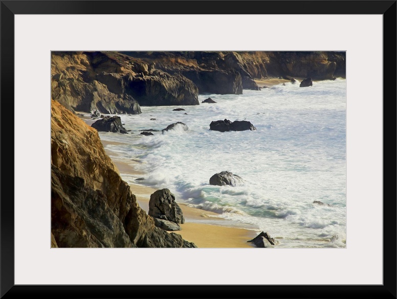 <p>Gentle waves reach the bluffs at Garrapata Beach in Big Sur, their cool colors complementing the warm tones of the beach, rock formations and coastal shrubs.</p>