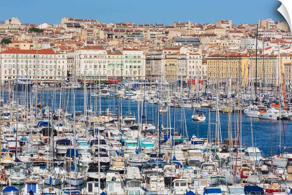 <p>Marseille, Provence-Alpes-Cote d'Azur, France. High view down onto Vieux-Port, the Old Port, and the city.</p>