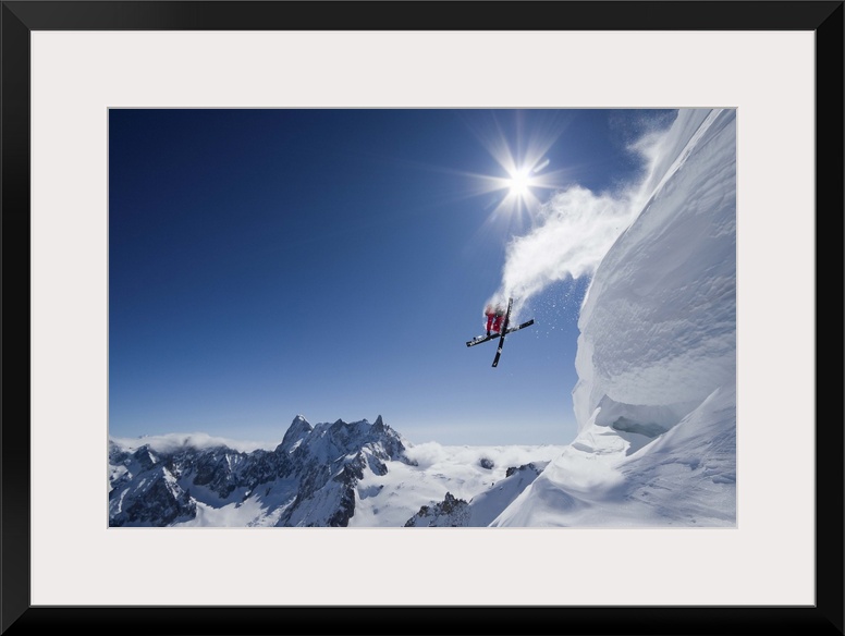 <p>Skier Guerlain Chicherit jumping off a snowy cliff, Chamonix, France</p>