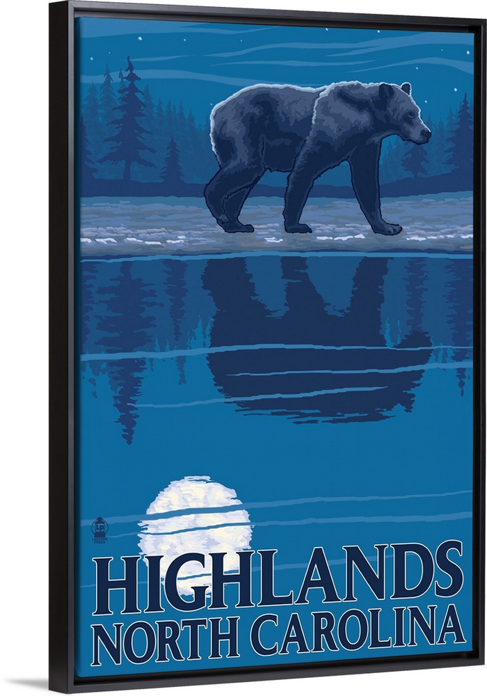 <p>Retro stylized art poster of a bear walking along a river at night. With the moon and bear casting a reflection.</p>